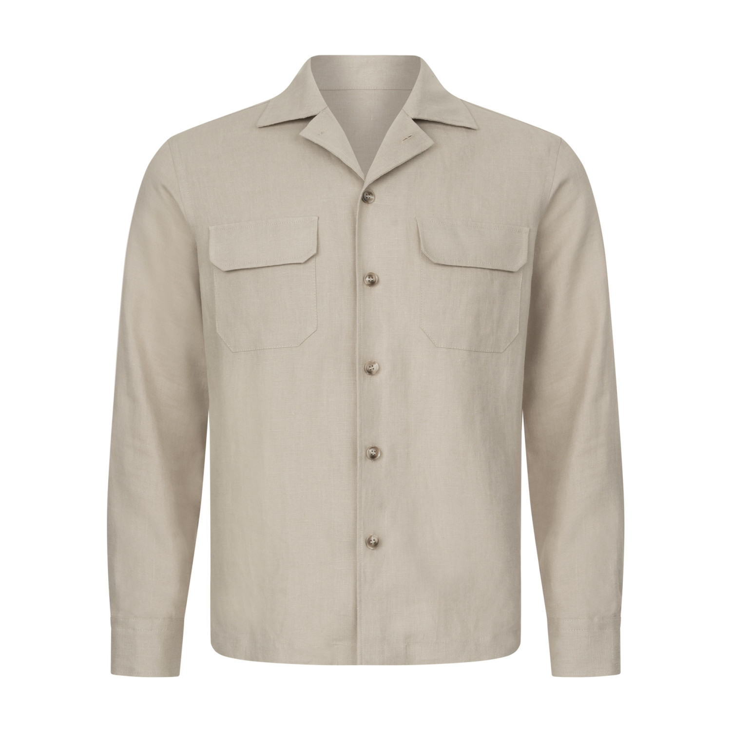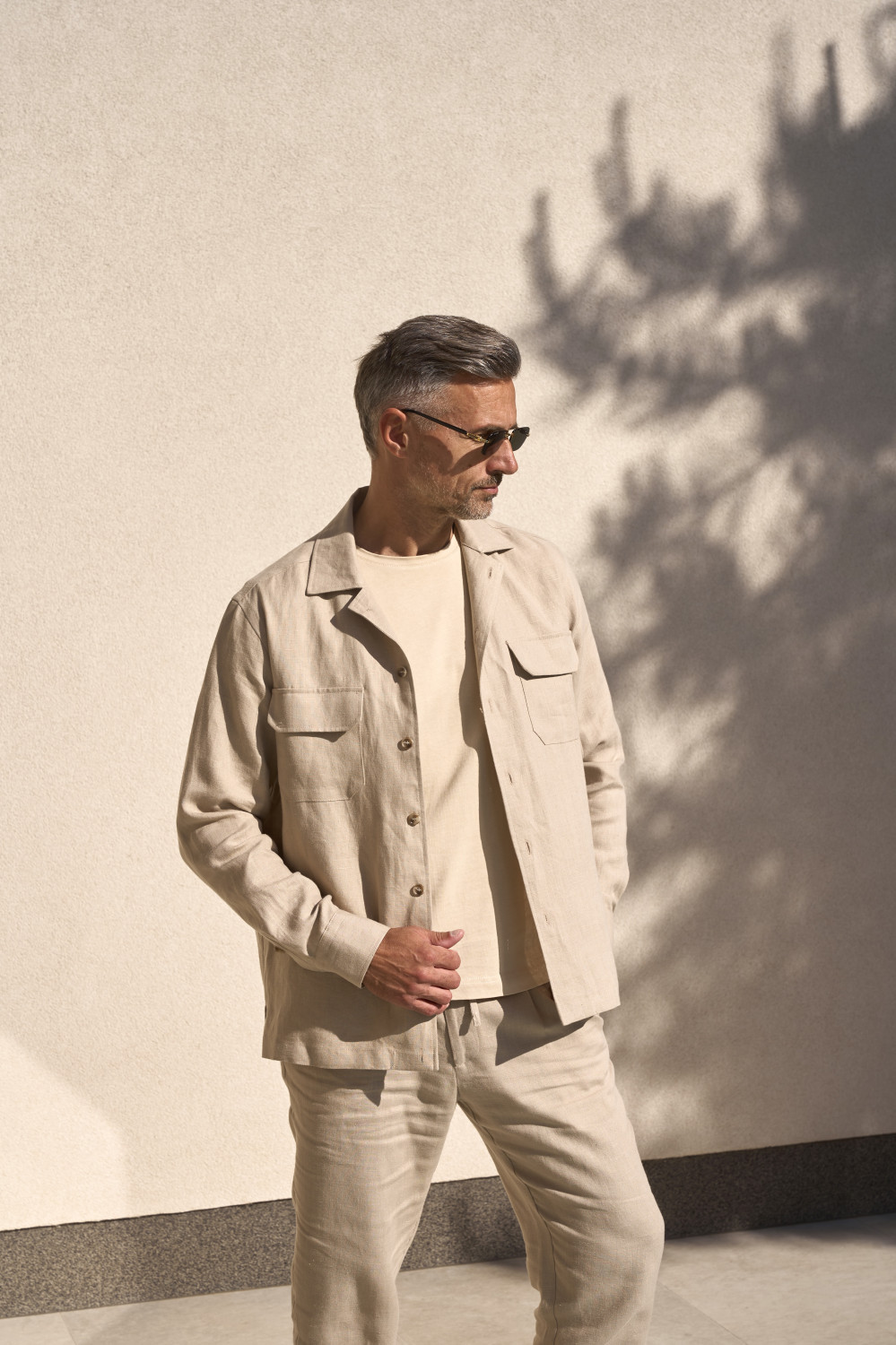 The relaxed straight cut offers a refined silhouette with effortless ease, while the sandy beige tone draws inspiration from nature and the warmth of the season. Functional chest flap pockets and a classic collar make it more elegant.