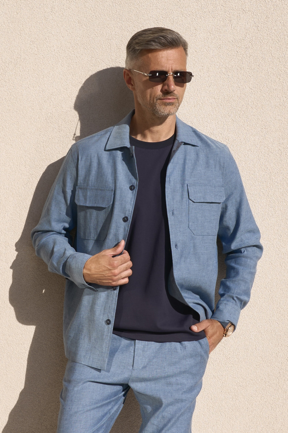 The relaxed straight cut offers a refined silhouette with effortless ease, while the denim tone draws inspiration from nature and the warmth of the season. Functional chest flap pockets and a classic collar make it more elegant.