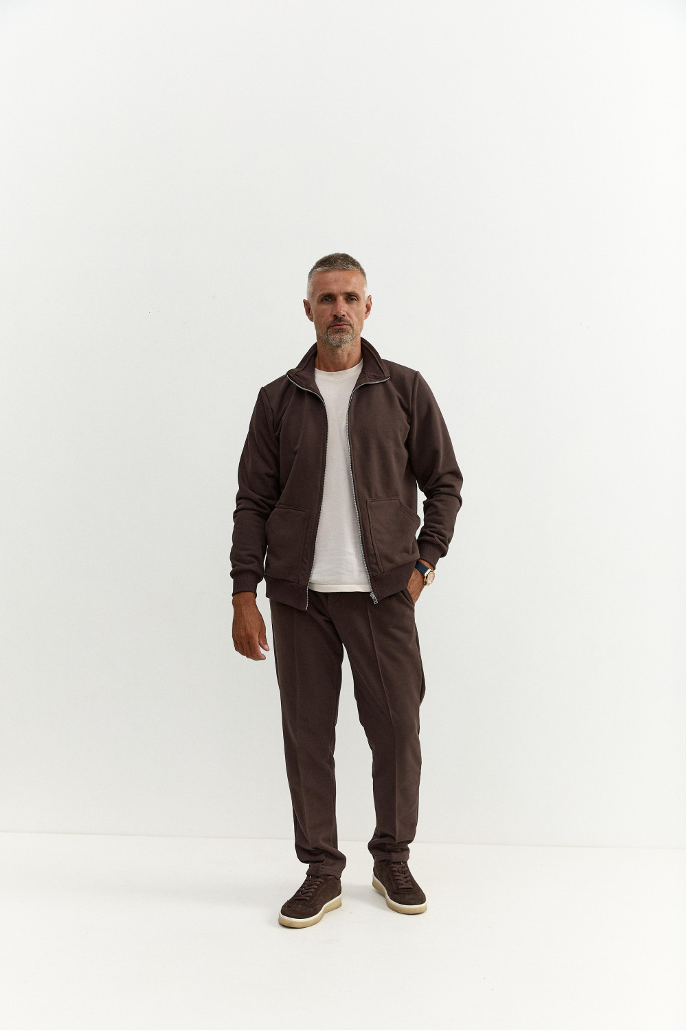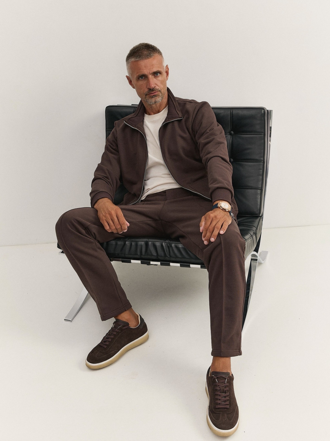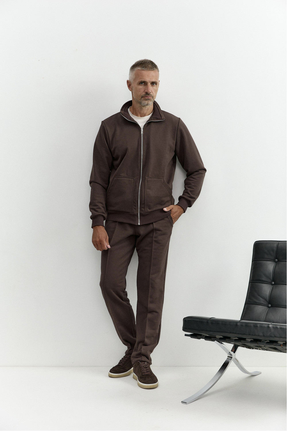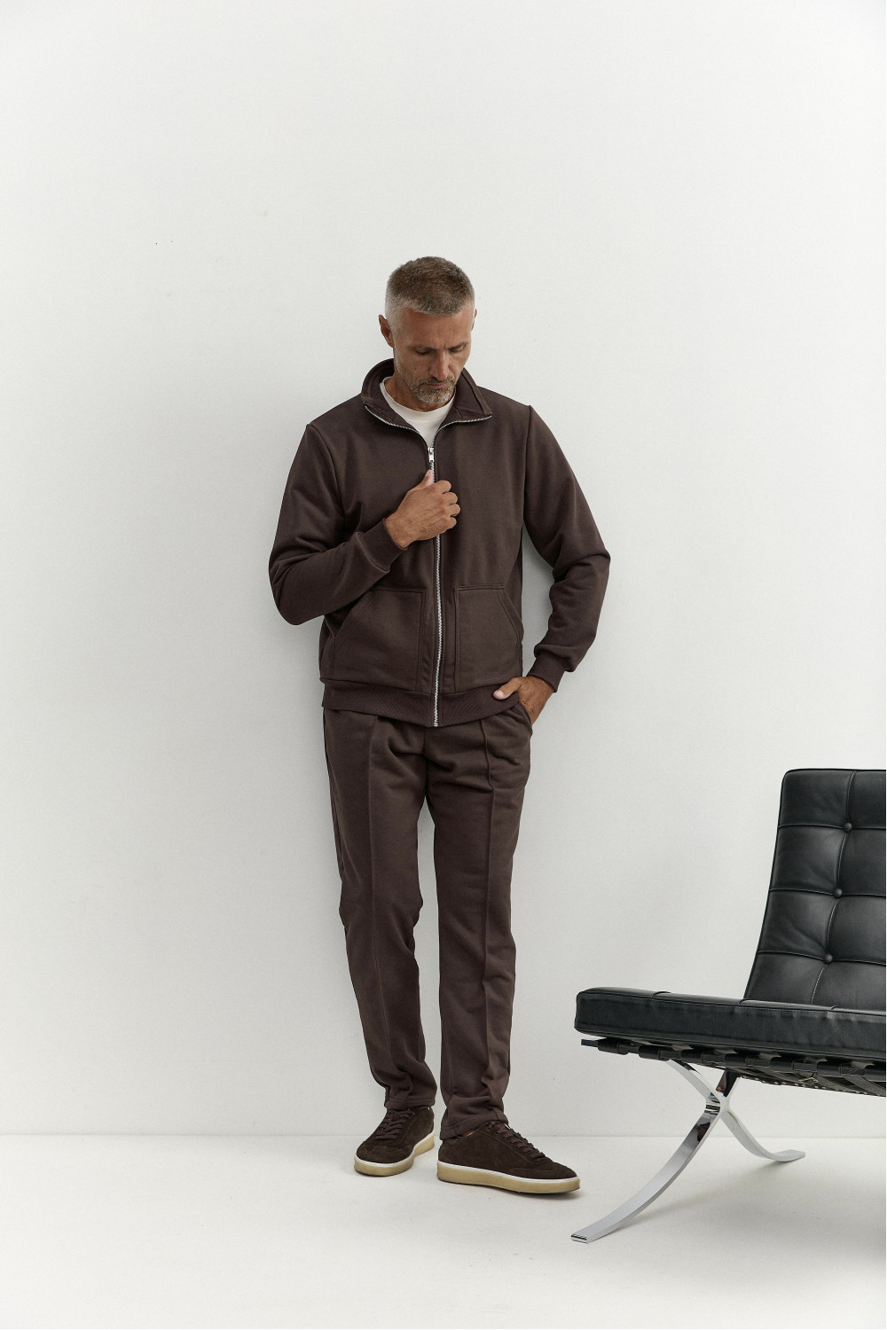 A casual suit combines masculinity, elegance and style. Natural Italian knitted fabric with wool, high-quality steel fittings and decorative inserts emphasize the modern style. A suit combined with a T-shirt with long or short sleeves. An ideal choice for an active business rhythm of life and everyday wear without losing style