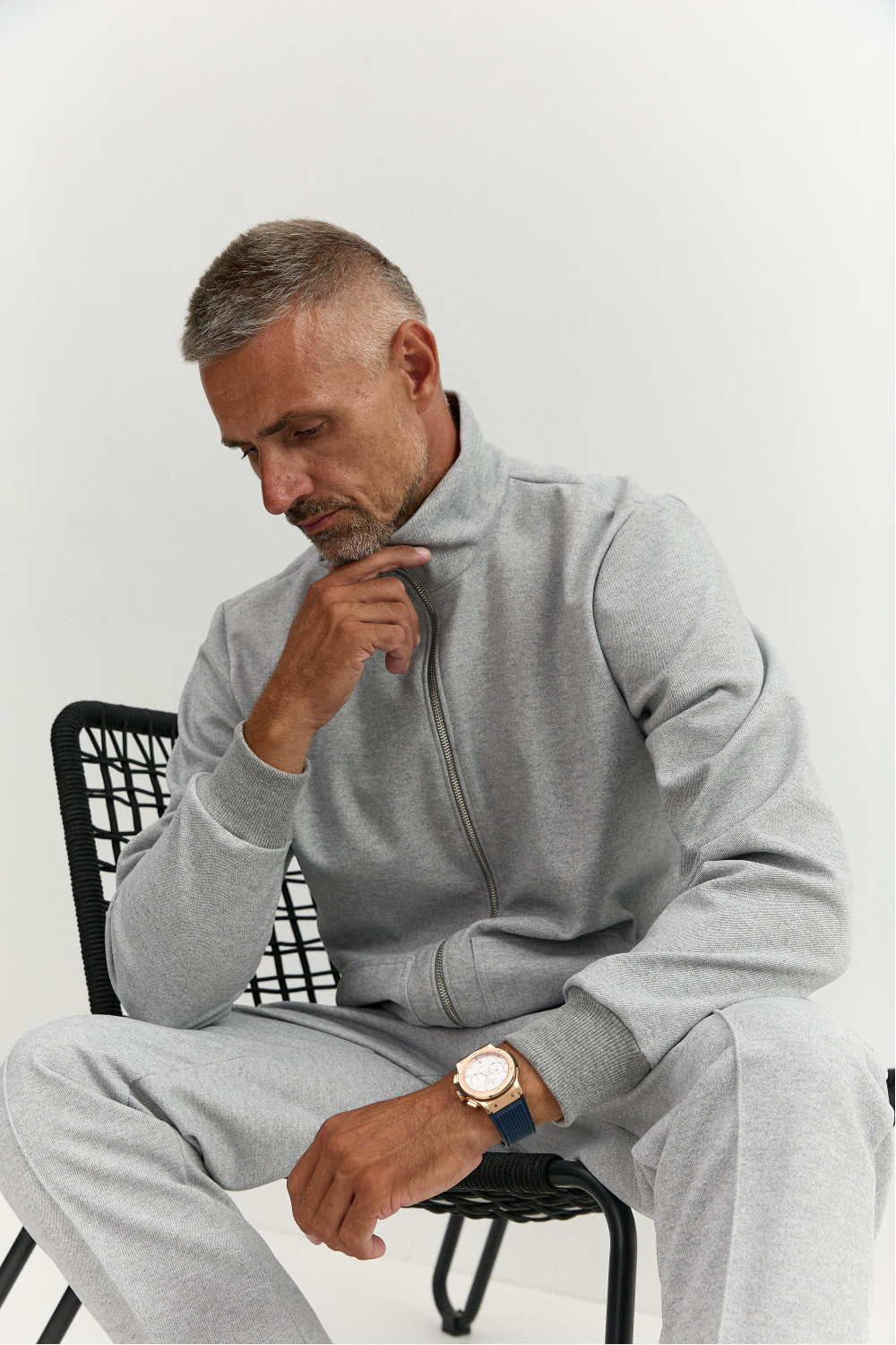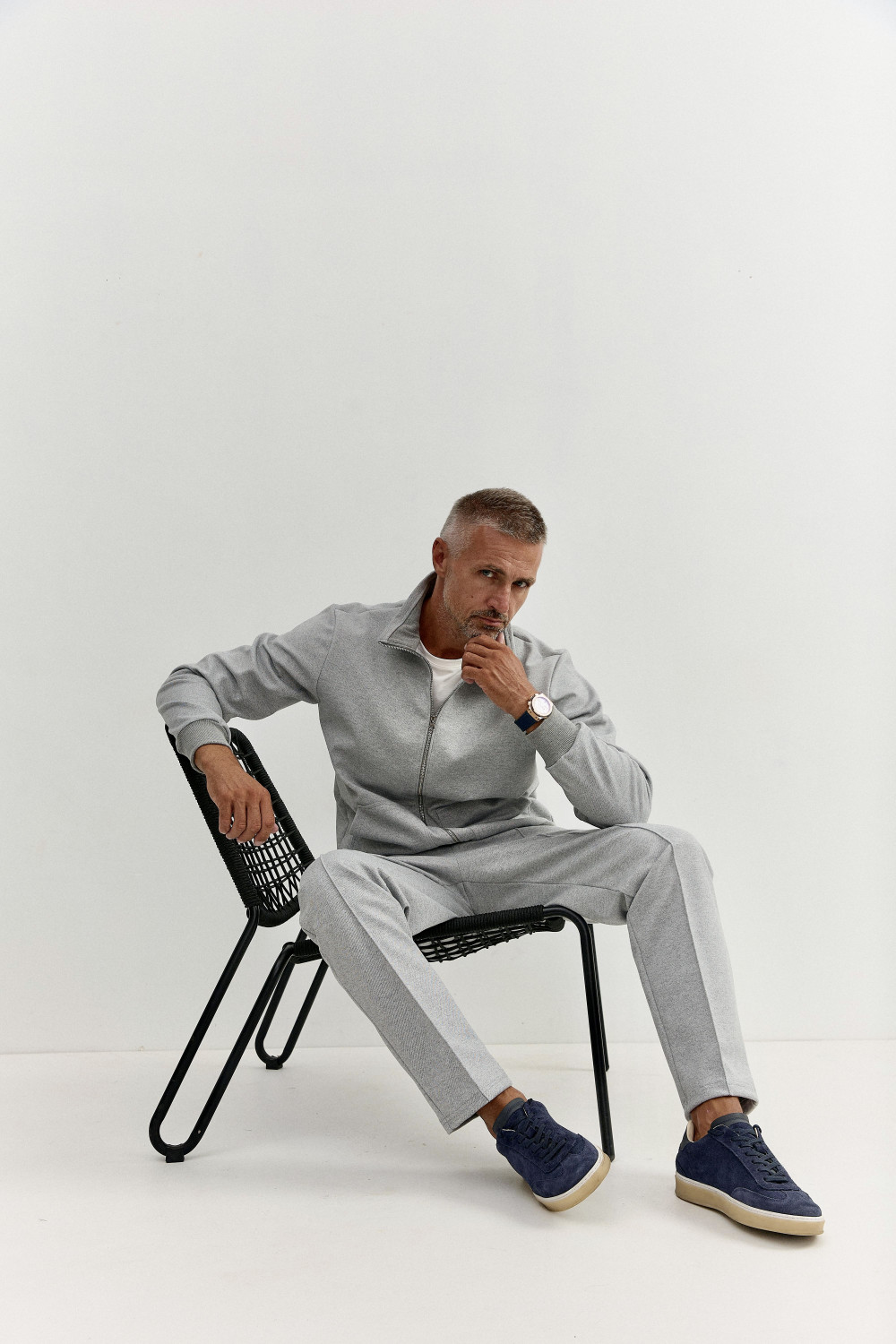 A casual suit combines masculinity, elegance and style. Natural Italian knitted fabric with wool, high-quality steel fittings and decorative inserts emphasize the modern style. A suit combined with a T-shirt with long or short sleeves. An ideal choice for an active business rhythm of life and everyday wear without losing style