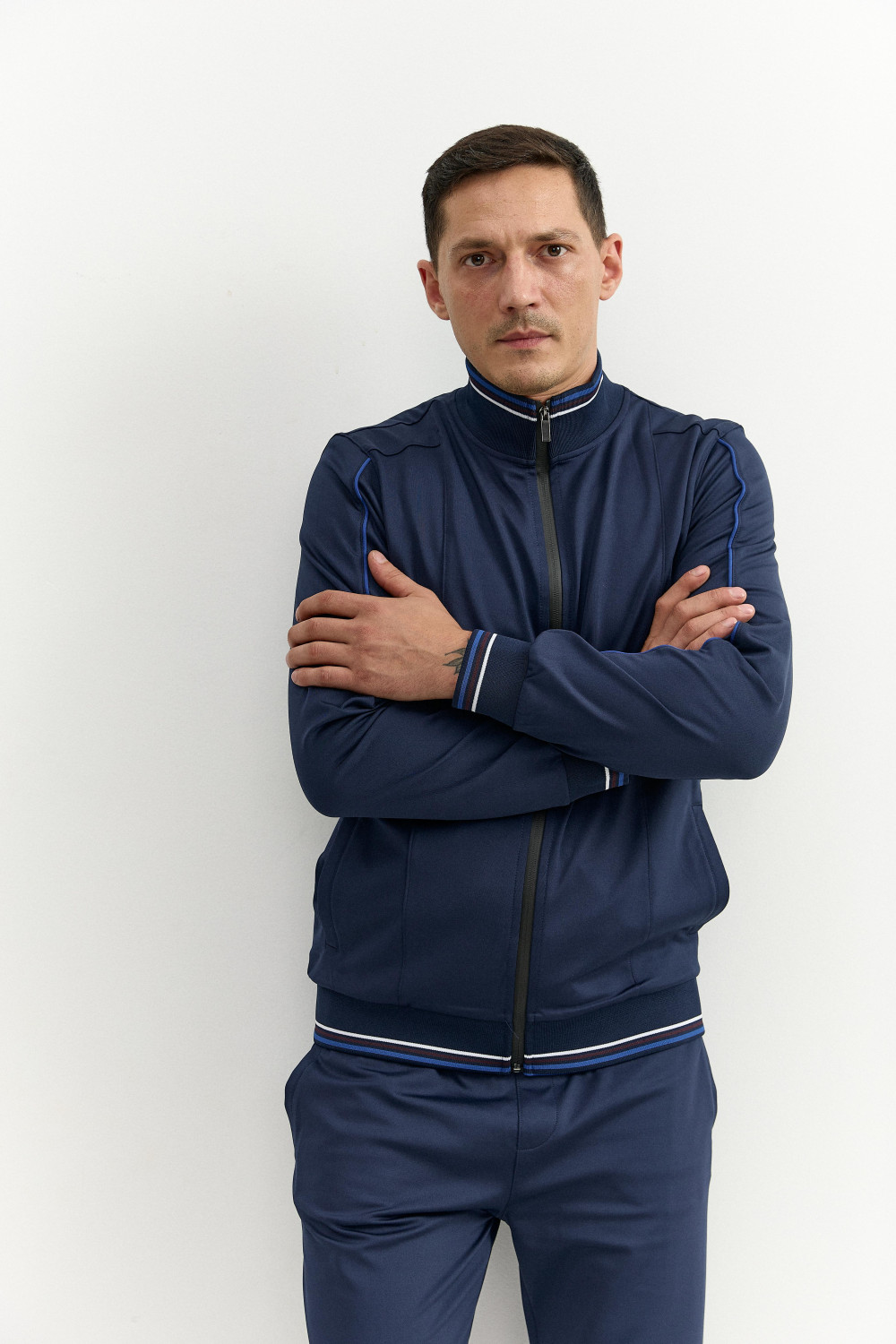 The zip-up jacket with a stand-up collar is accentuated by sleek side stripes along the sleeves, adding a touch of dynamic elegance. The trousers, featuring an elastic waistband and practical side pockets, complete the set with a perfect balance of functionality and style. An ideal outfit for active leisure, travel, or urban living—where comfort and refined minimalism are always essential.