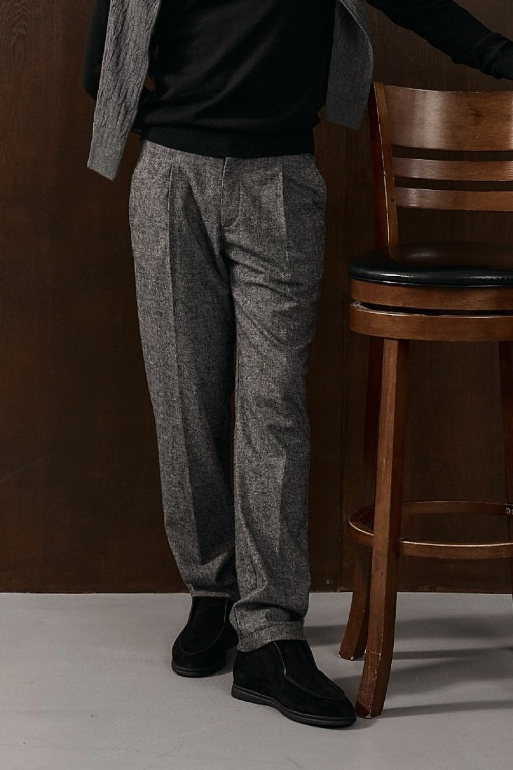 The trousers are crafted from a premium Italian suiting fabric with a high content of natural wool. The deep dark-grey mélange (heathered) shade with a rich texture makes them a versatile foundation for the autumn-winter wardrobe.